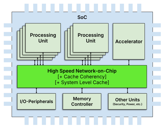 Our configurable IP portfolio covers on-chip data movement, synchronization, and storage—starting with a high-performance Network-on-Chip (NoC) that can be tailored from a lightweight, non-coherent interconnect to a fully coherent NoC with integrated system-level cache. Our cache coherent solution has been tested up to 128 cores and is optimized for multi-chiplet systems. This modular architecture lets you select exactly the features you need, delivering maximum performance, scalability, and efficiency for any SoC design.